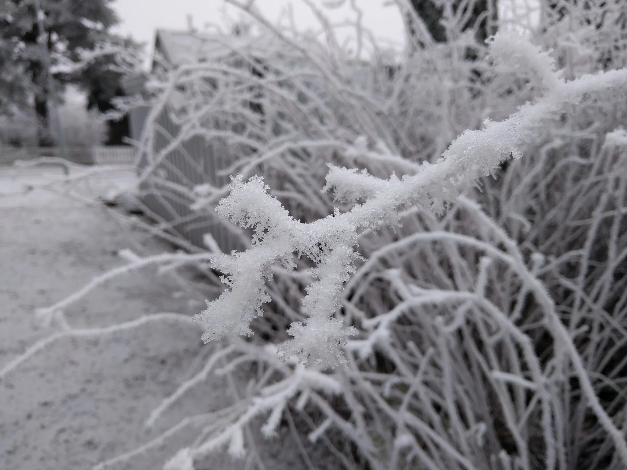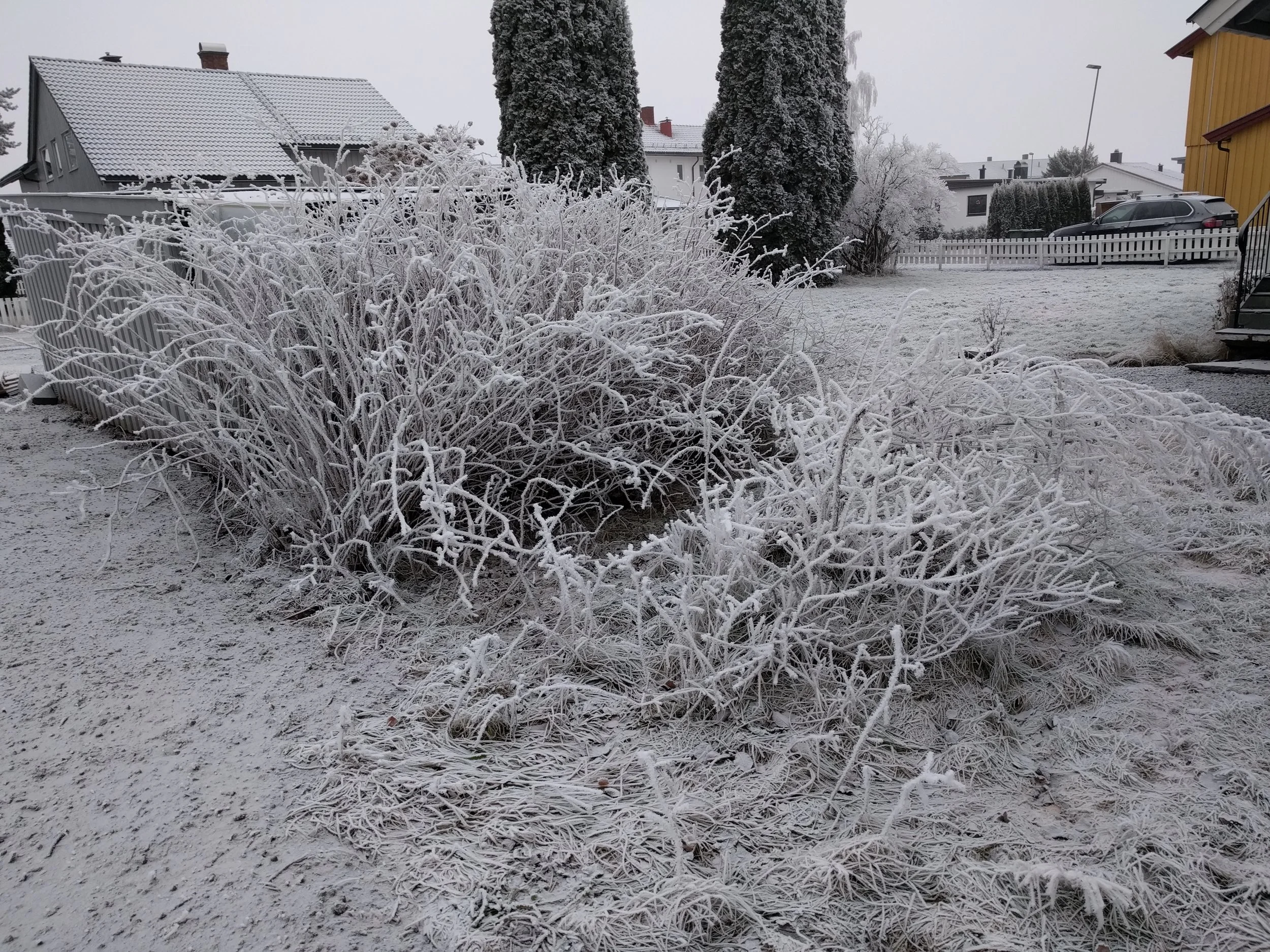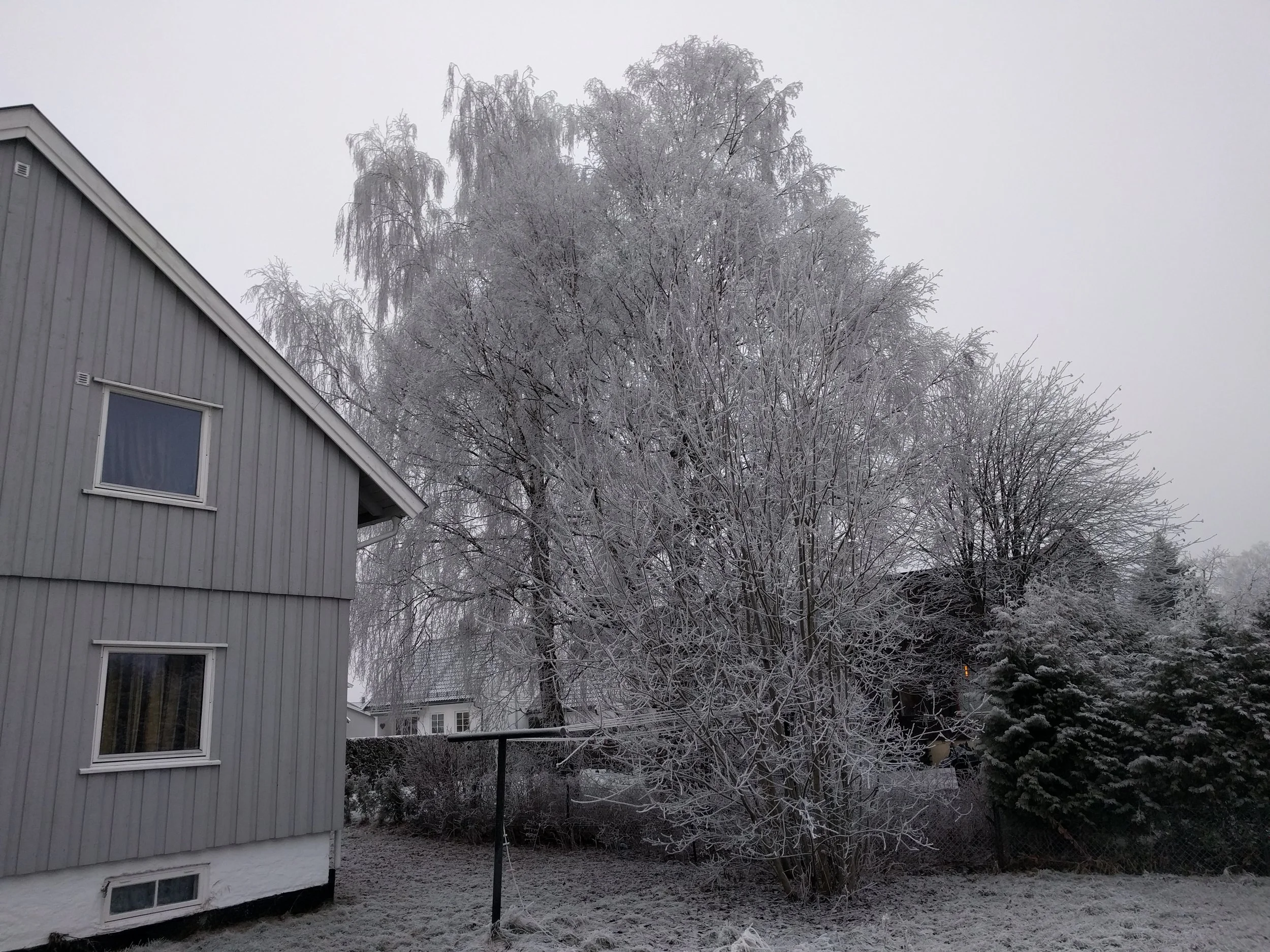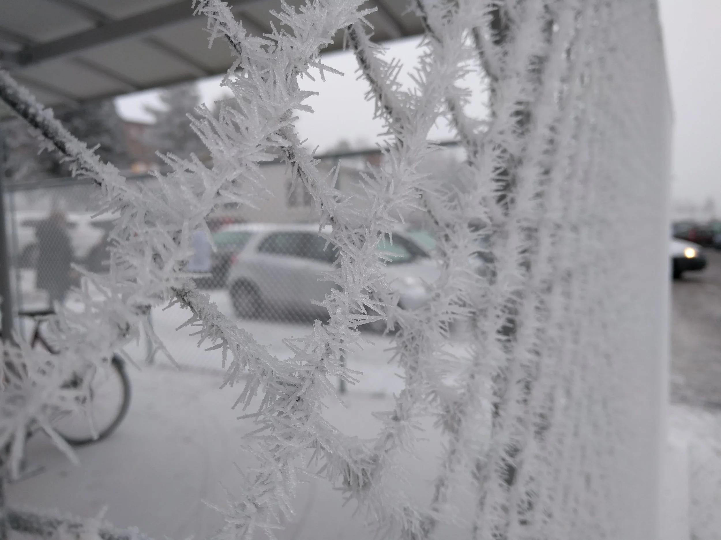 Thick winter fog deposited ice crystals on every viable surface over a few days. It seems like rime frost but a colleague from Minnesota mentioned "hoarfrost". Whether either or both, it was certain that this was a special sight in Norway.